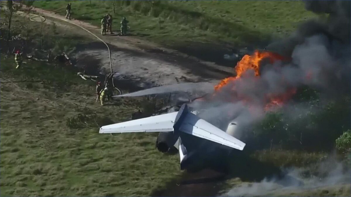 In videos shot by people in passing vehicles, a torrent of black smoke could be seen billowing above I-195 from the plane’s fuselage, which was resting on its side. Other rubble was strewn across a grassy median and nearby forest.