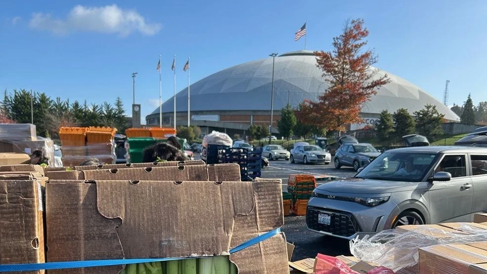 The Tacoma Dome venue selection providing massive parking capacity necessary for 900-vehicle accommodation, with the sports arena location typically hosting entertainment events now serving emergency humanitarian function demonstrating crisis severity.
