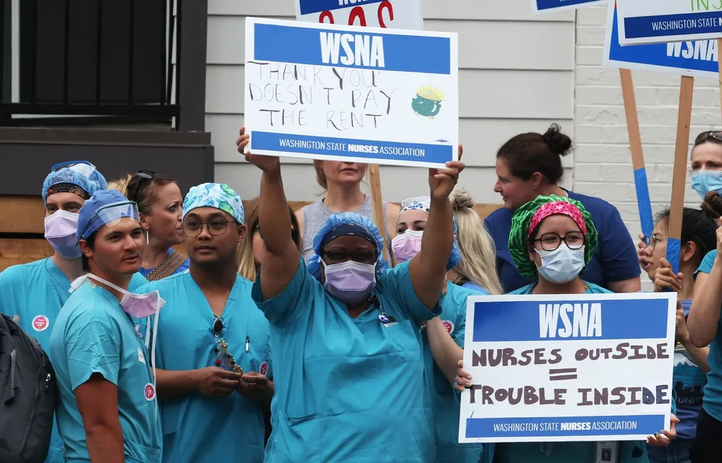 The morning and afternoon rallies drew support from labor leaders and elected officials as nurses represented by the Washington State Nurses Association pressed for changes they say are essential for safe patient care and worker protection.