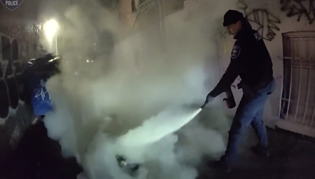 The officers’ fire extinguisher deployment likely involved dry chemical or CO2 extinguishers standard in patrol vehicles, designed for vehicle fires but adaptable for burning clothing though potentially causing respiratory distress when sprayed on a person’s face.