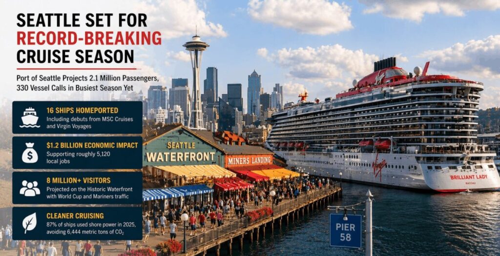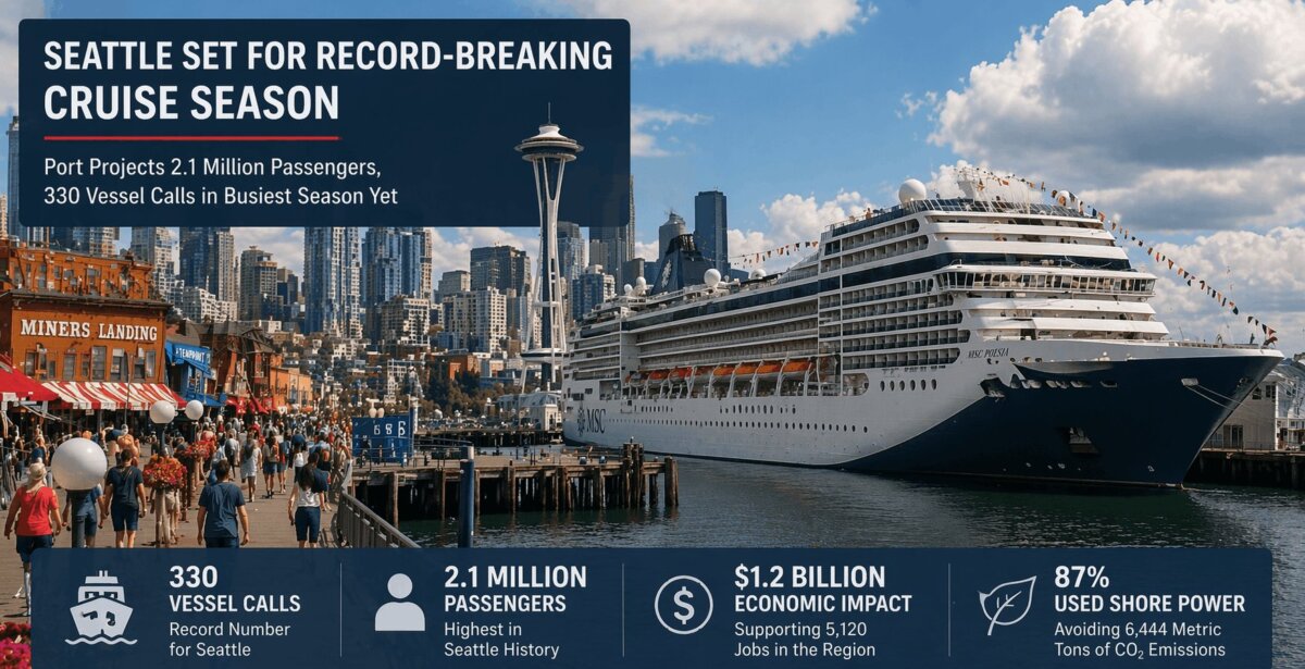 The Port of Seattle is launching its most ambitious cruise season in history on Friday, with officials projecting a record 330 vessel calls and approximately 2.1 million revenue passengers between now and 11 October, surpassing every previous season on record.