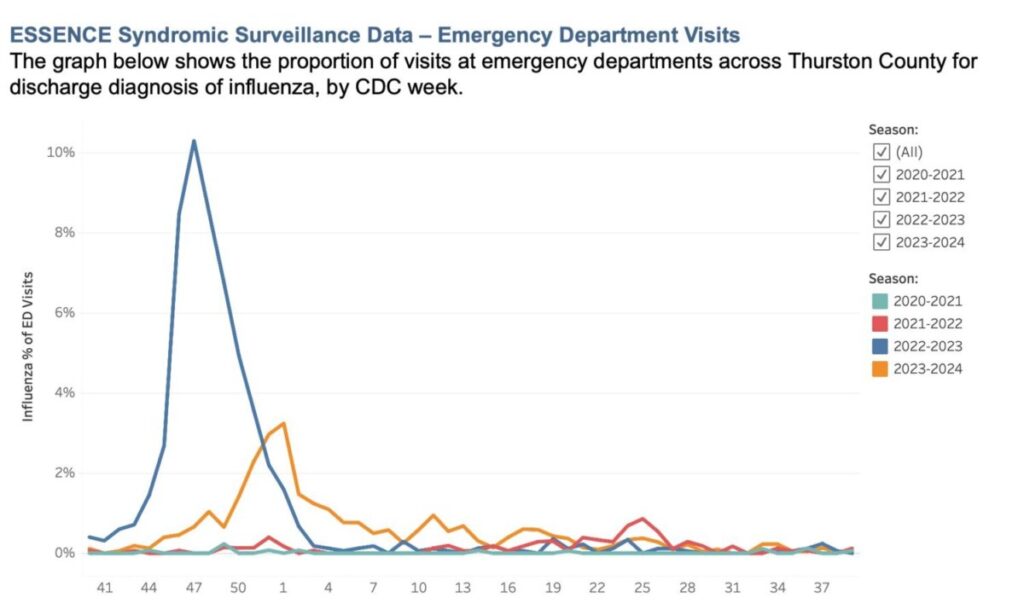 “Individuals who get sick with flu symptoms should stay home and avoid contact with others, except to get medical care,” Thurston County health officials said. “While most people with flu have mild illness and do not need medical care or antiviral medications, certain people are at increased risk of serious complications, including young children, people 65 and older, pregnant people, and people with certain medical conditions.”